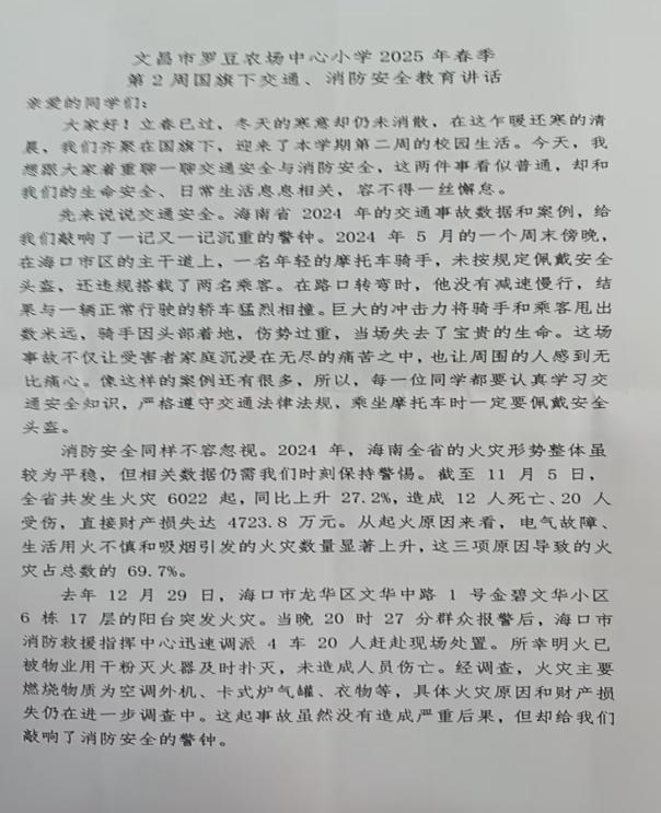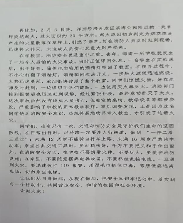 周校长主要从交通安全和消防安全对学生进行教育,通过一些交通事故的例子教育学生遵守交通安全的有关规定。同时,教育学生注意消防安全,和相关的消防知识。通过安全教育保障了学生身心健康,增强了学生自保能力,促进了学生全面发展,维护了学校和社会稳定。学校将继续坚持不懈地加强德育教育和安全教育,为学生的健康成长保驾护航。