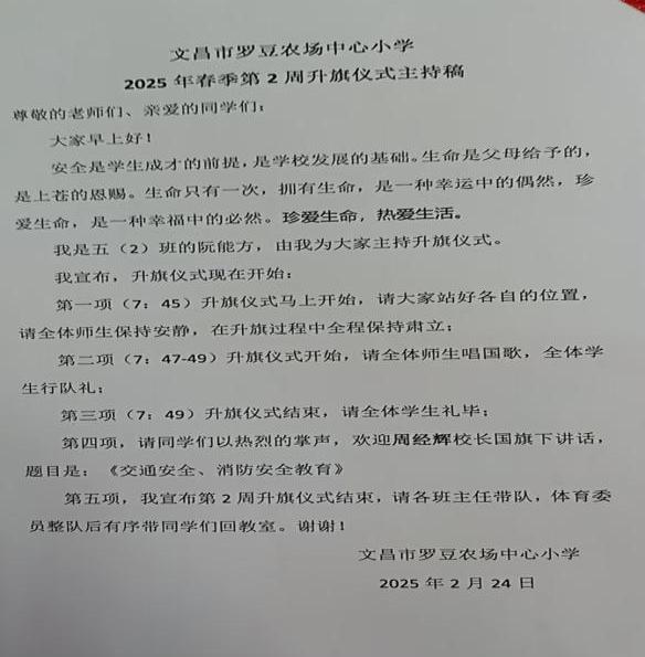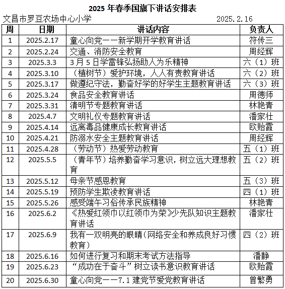 学校升国旗仪式是一项重要的少先队仪式,优秀精彩的“讲话”能传递正能量,激励师生更加热爱祖国、热爱党,帮助学生树立远大理想,实现美丽梦想,形成正确的人生观、世界观、价值观。为了促进学校的德育,提高学生的爱国爱党情怀,培养学生的思想道德、文明礼仪、行为规范、安全健康等方面的发展,文昌市罗豆农场中心小学每星期一举行升旗仪式,通过国旗下教育讲话,促进学校德育的发展。