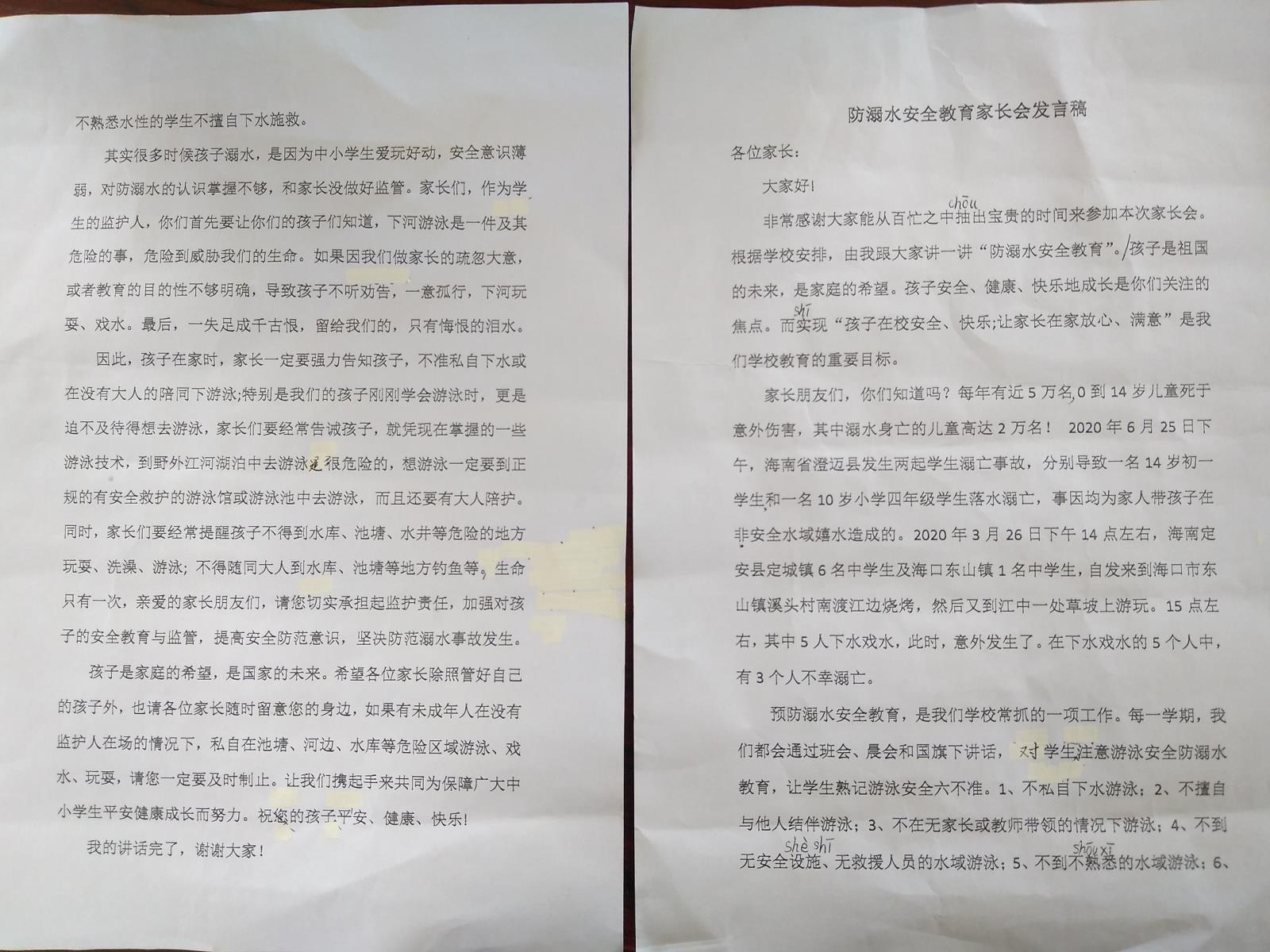 潘家壮大队辅导员给家长做防溺水相关知识和家长责任的讲话,主要简短讲述一些溺水安全事故例子,增强家长监管子女的职责意识,让家长了解学校的防溺水安全教育工作的情况,树立起家长配合学校教育监管孩子健康快乐成长的意识。