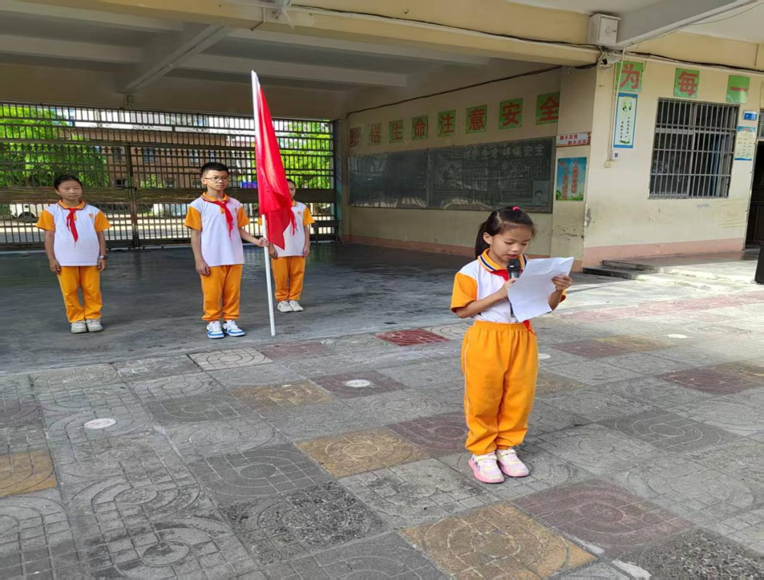 由大队辅导员领呼:我们是中国少年先锋队队员,我在队旗下宣誓“我决心遵照中国共产党的领导,好好学习,好好锻炼,好好劳动,时刻准备着为共产主义事业而奋斗!”