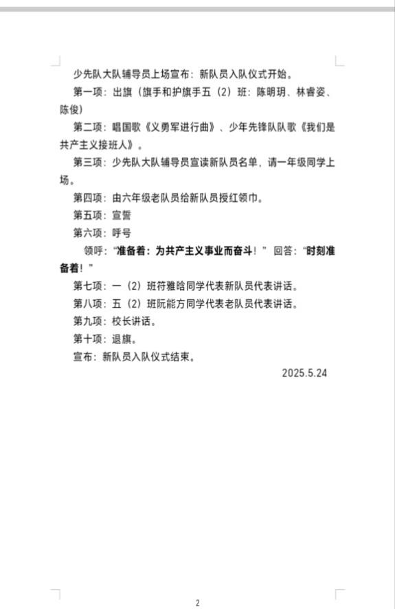根据上级部门文件要求,为了壮大我校少先队组织力的量,教育学生继承和发扬中国少年先锋队的光荣传统,培养少先队员健康向上,积极进取的精神,增强学校少先队组织的力量,促进我校红领巾事业的蓬勃发展,学校决定在2025年5月28日举行少先队新队员入队仪式。