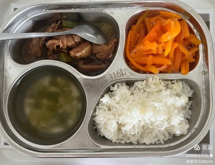 午餐:莴笋香菇烧鸭肉、红萝卜炒粉丝、紫菜骨头汤、软米饭