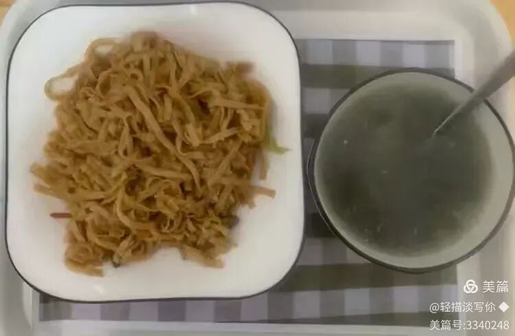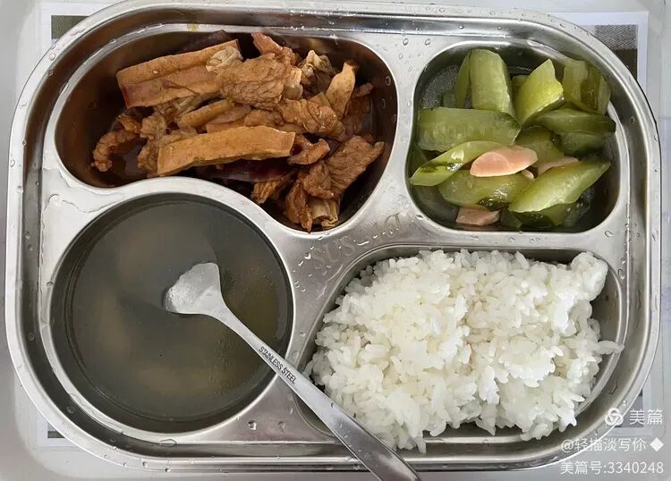 午餐:肉丝炒豆干。黄瓜炒火腿、海带骨头汤、软米饭