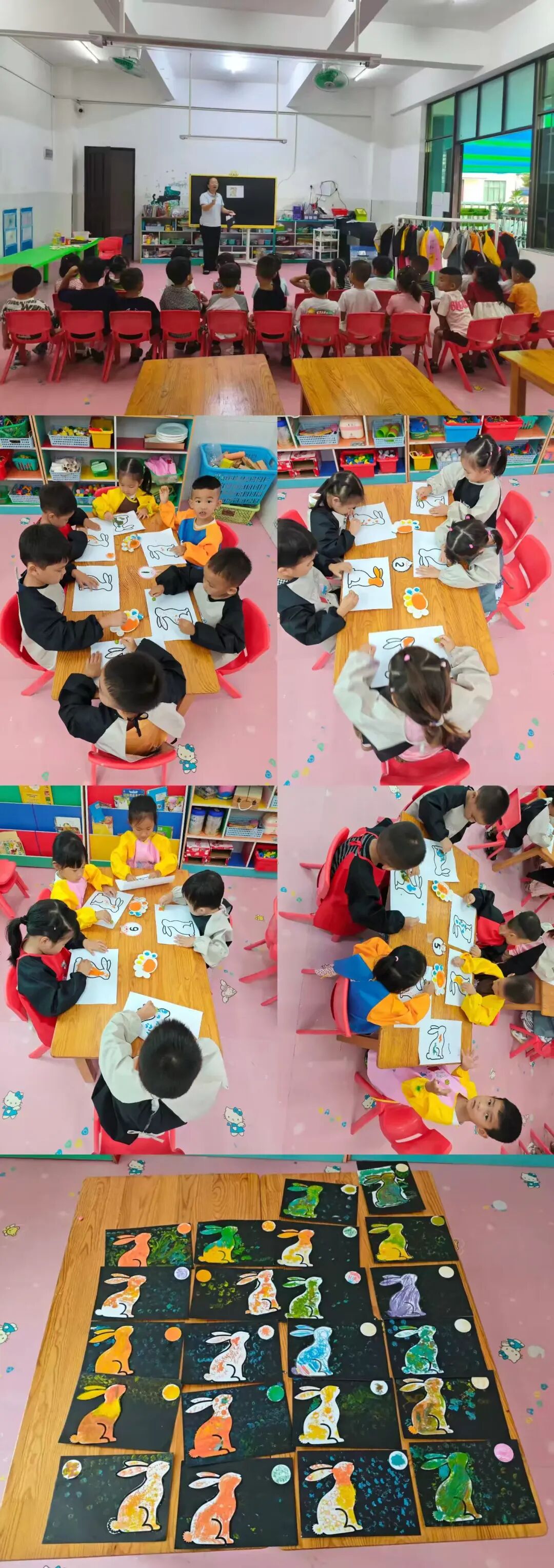 2.运用颜料、按压工具和剪刀等操作,完成“兔子望月”手工,锻炼手部精细动作。