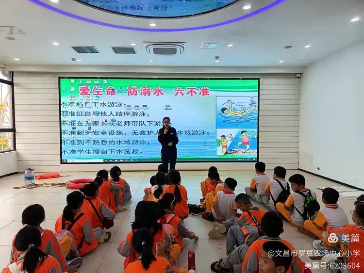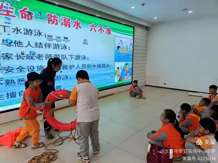 让学生知道预防溺水安全教育中的“六不准”,如何利用救生圈、绳子和竹竿等对溺水者进行施救。