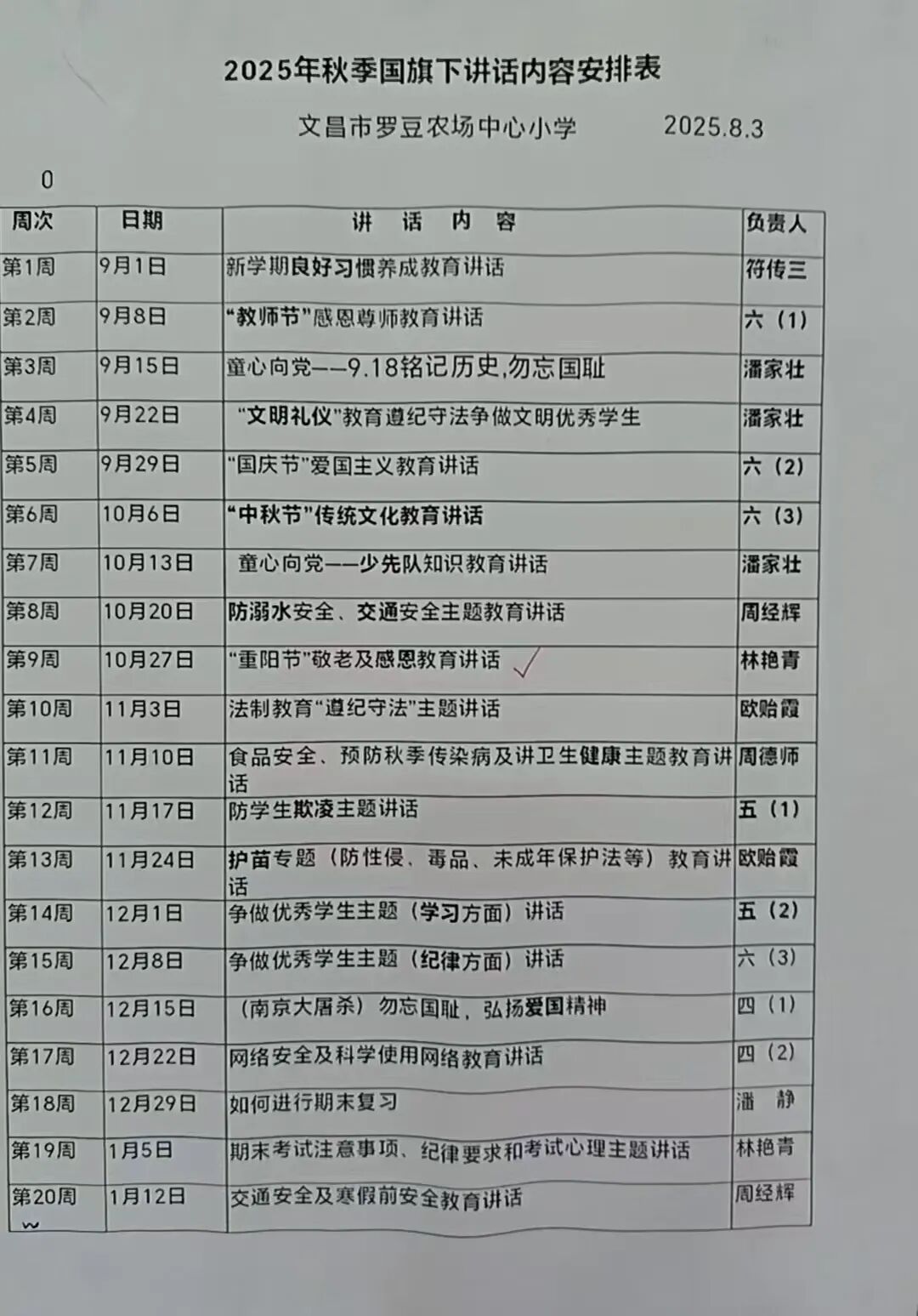 为了促进学校的德育的发展,提高学生的爱国爱党情怀,培养学生的思想道德、文明礼仪、行为规范、安全健康等方面的发展,学校在每个星期一举行升旗仪式。通过国旗下教育讲话,开展主题丰富的教育活动,培养学生爱国主义精神,积极向上的精神风貌,努力拼搏的学习热情,提升学生的素质。