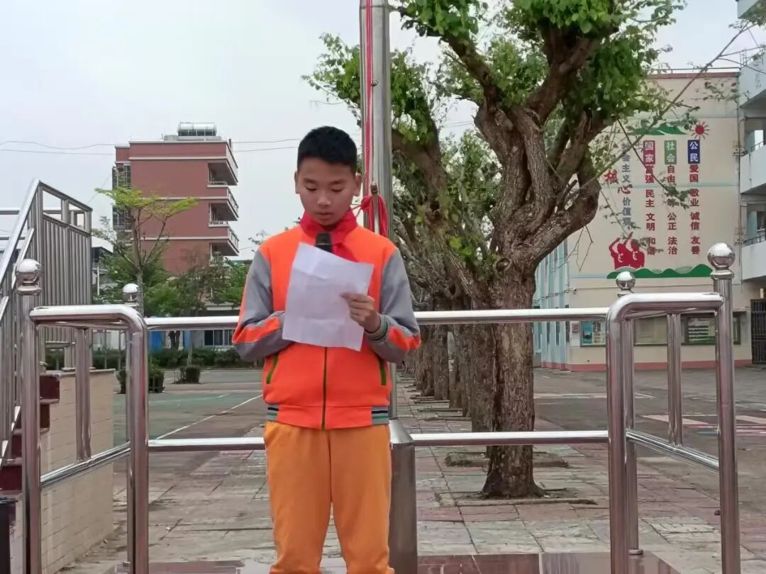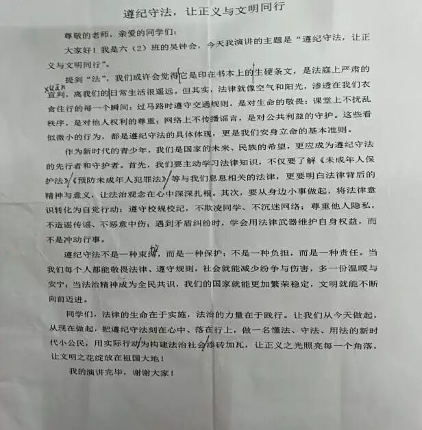 六(2)班吴钟会同学国旗下讲话,主题是:《遵纪守法让正义与文明同行》 。