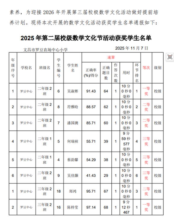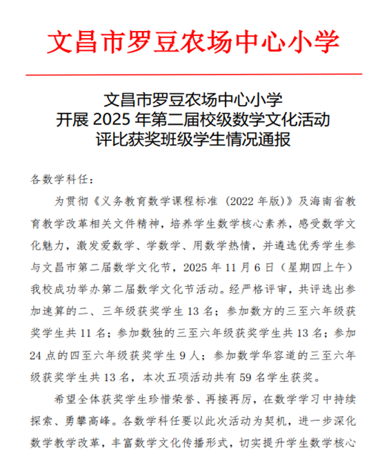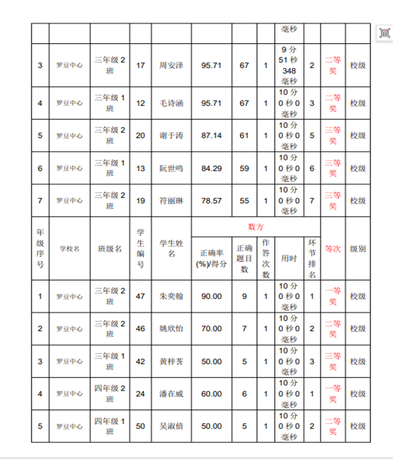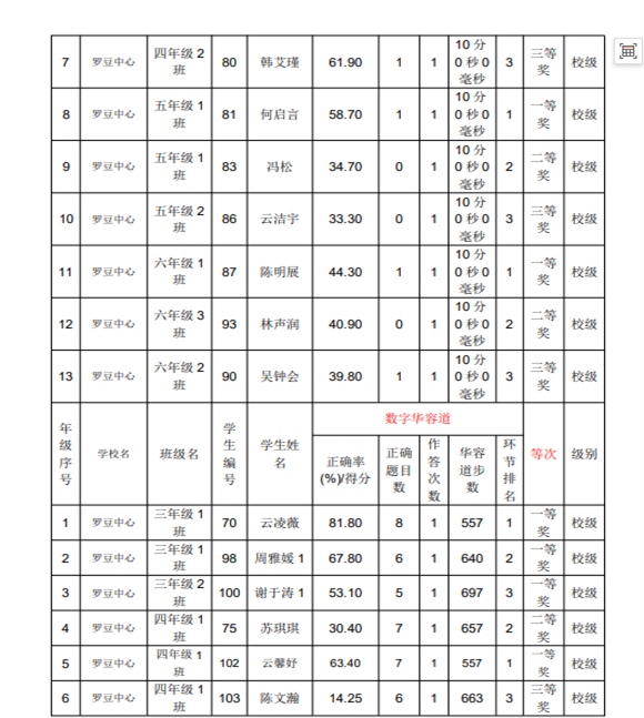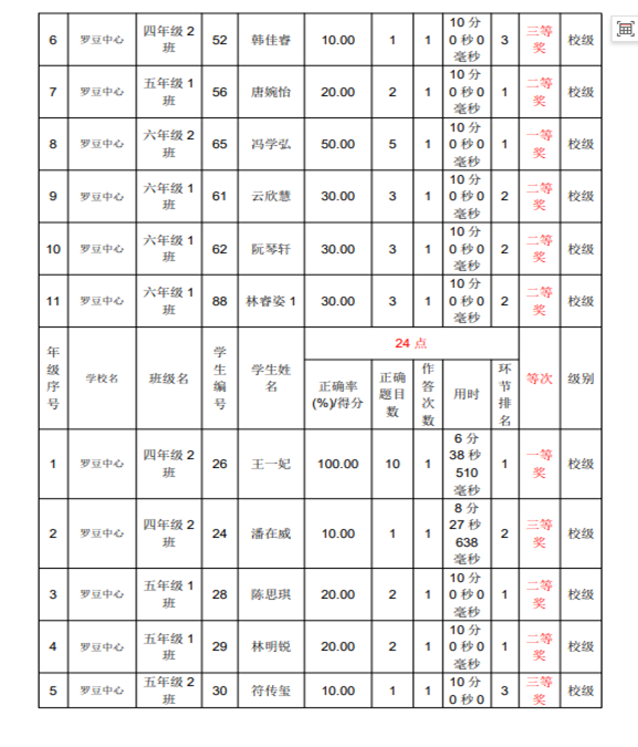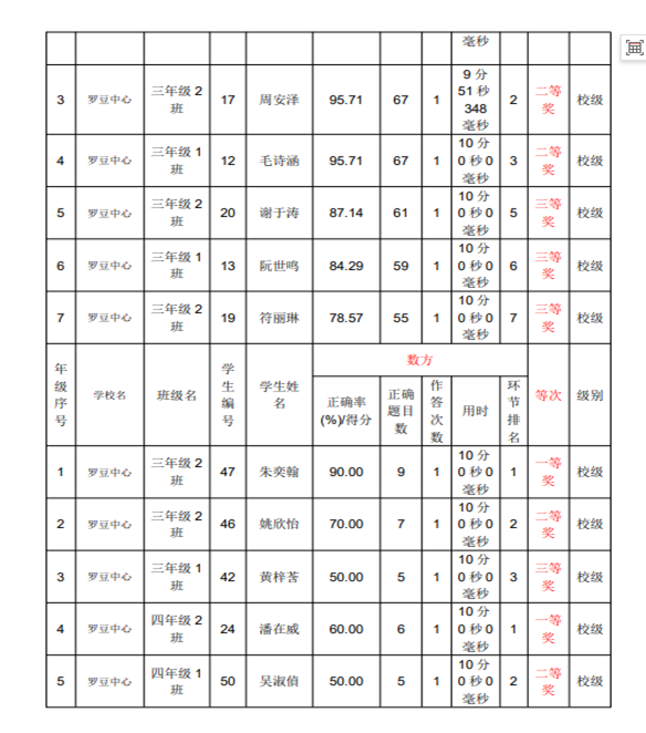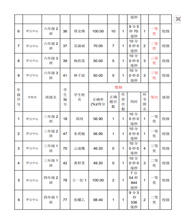 经下载数据严格评审,共评选出参加速算的二、三年级获奖学生13名;参加数方的三至六年级获奖学生共11名;参加数独的三至六年级获奖学生共13名;参加24点的四至六年级获奖学生9人;参加数学华容道的三至六年级获奖学生共13名,本次五项活动共有59名学生获奖。