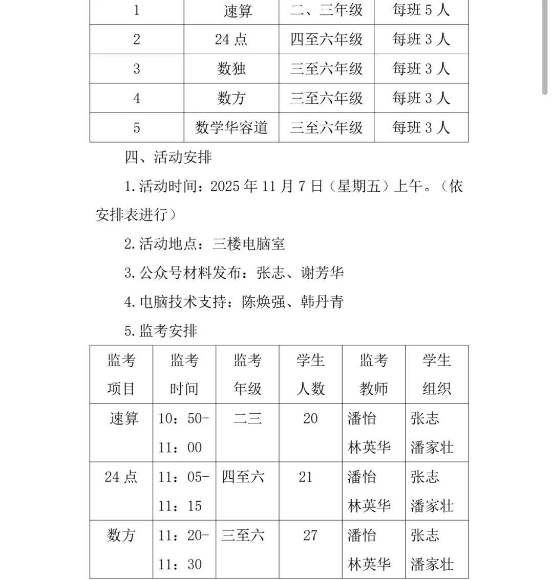 本次数学文化活动工作方案由周经辉副校长负责落实制定,活动方案以感受数学魅力,发展核心素养为主题,开展速算、24点、数独、数方、数学华容道五项主题数学活动评比。