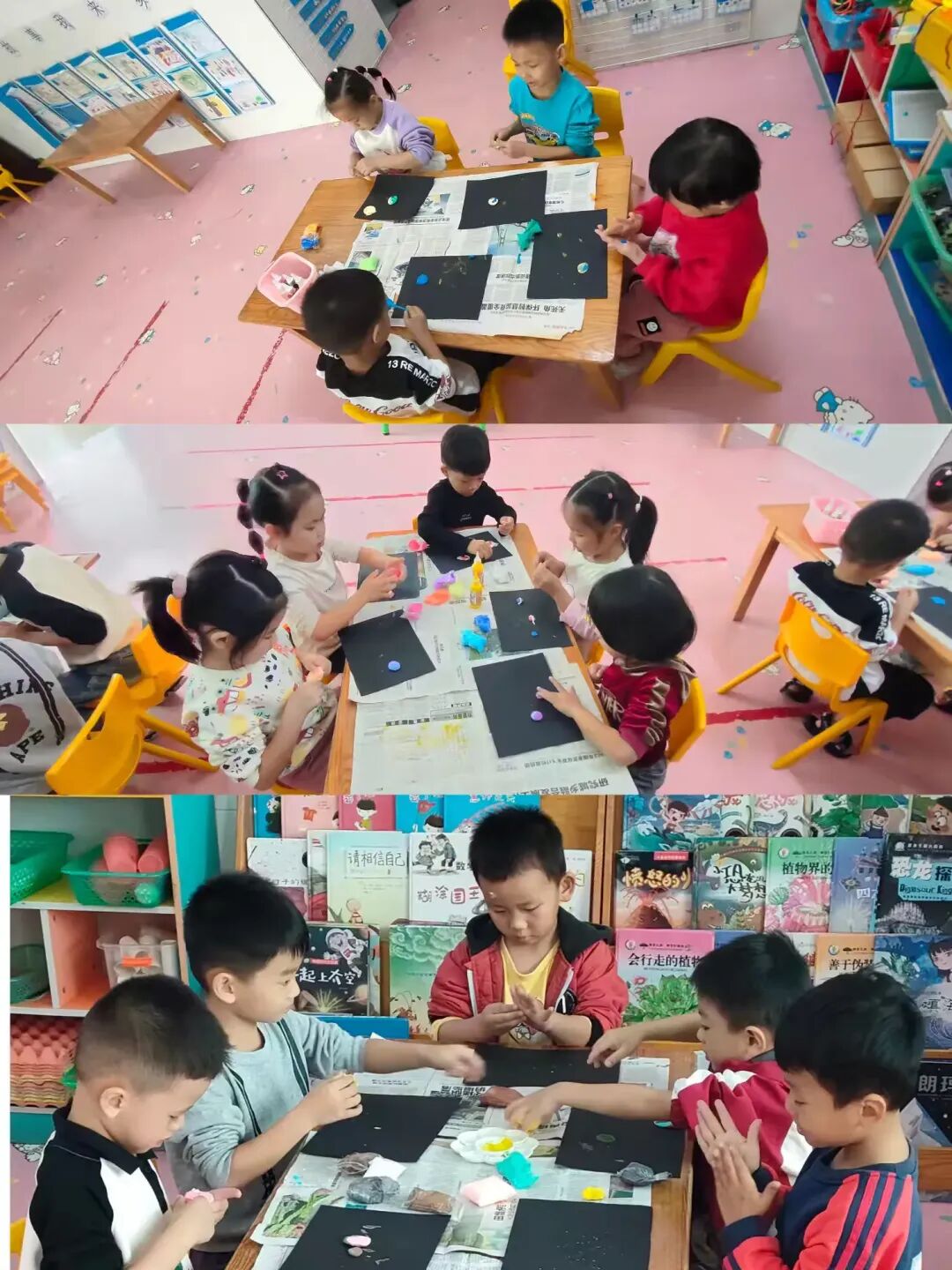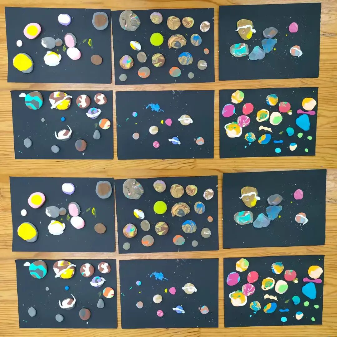1.尝试运用黑色卡纸、橡皮泥、颜料等材料,通过揉、压、粘、点画等技能创作独特的星球,发展动手能力和想象力。
