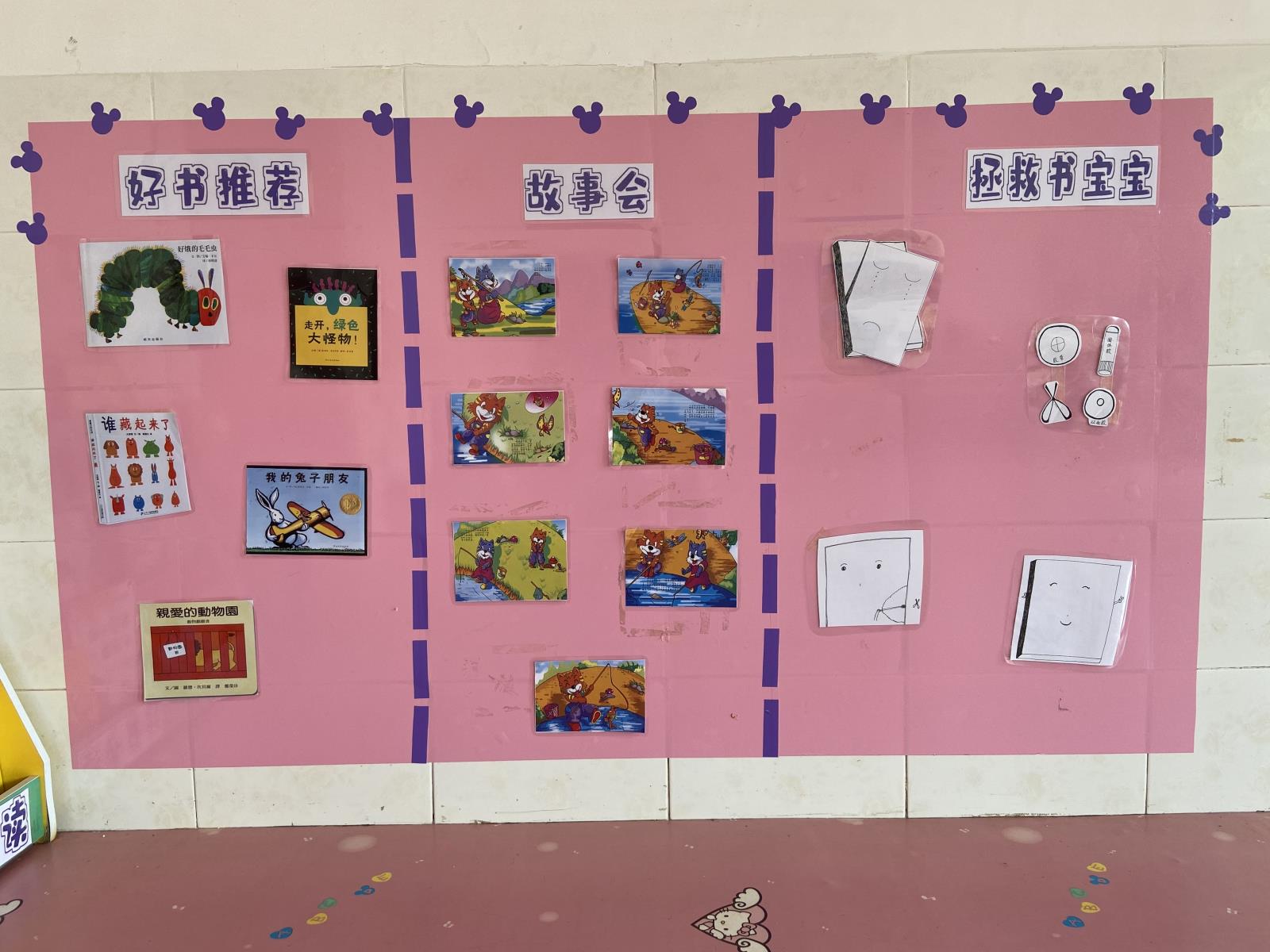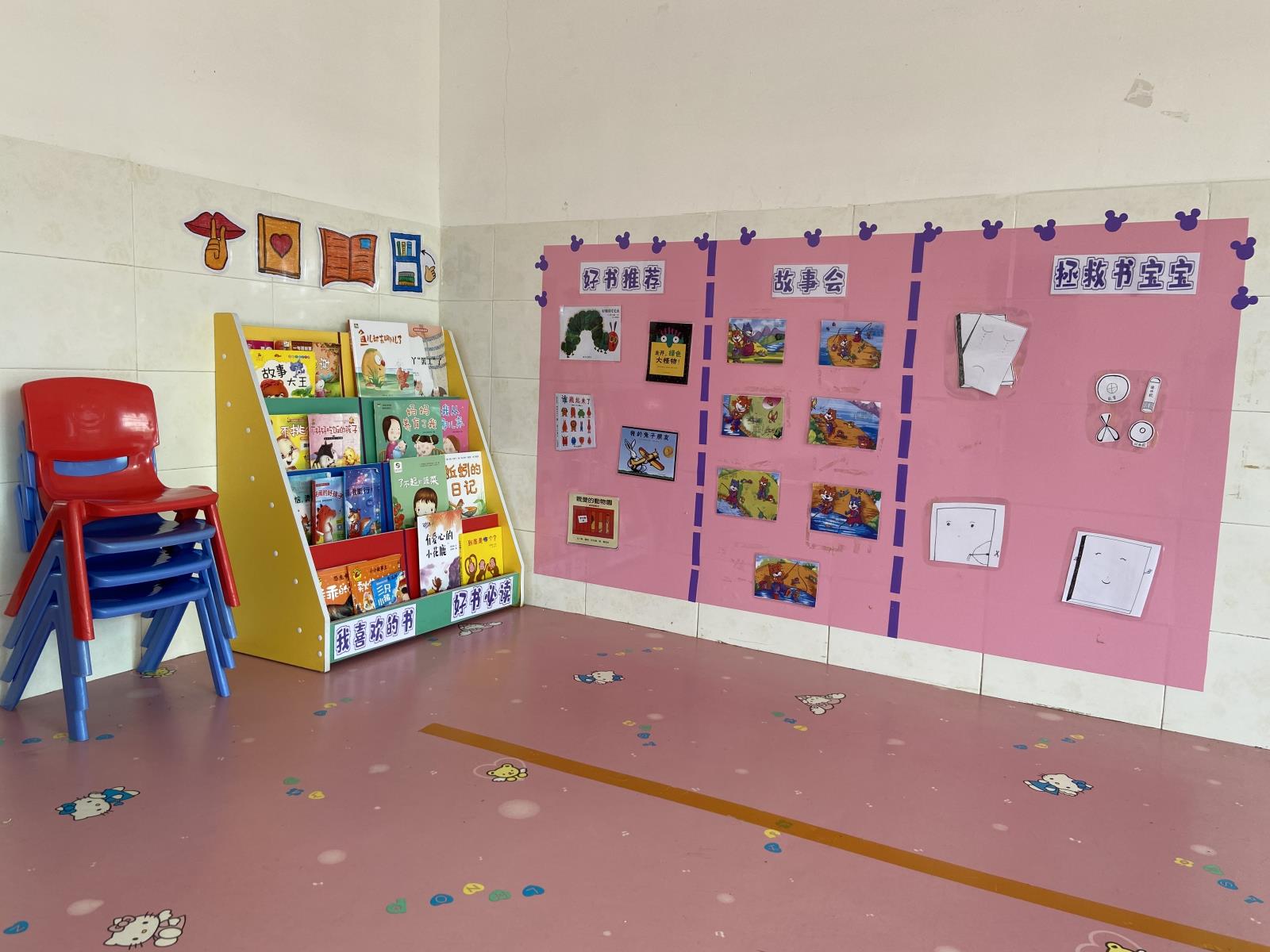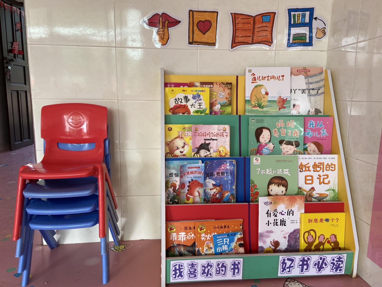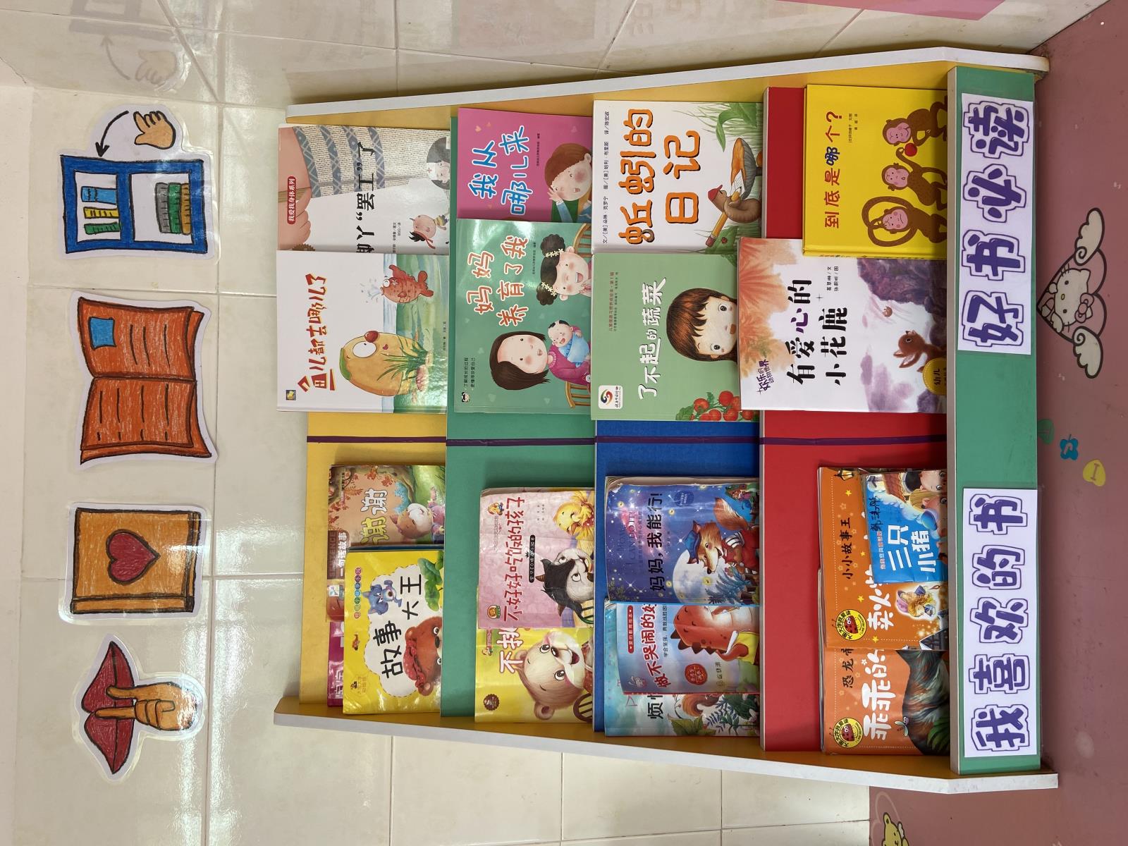 老师精心整理布置书架,添置孩子喜欢的图书,吸引孩子阅读兴趣。