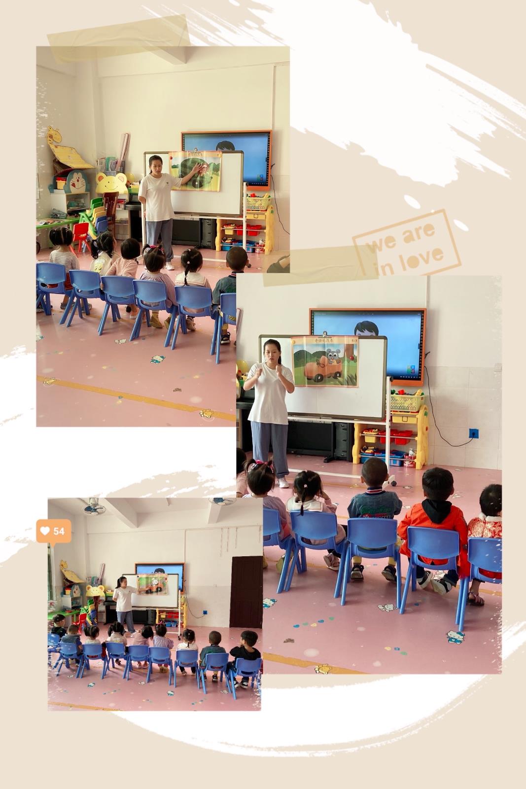 孩子们喜欢听老师讲故事,感受故事中的图案色彩,感受故事中的人物变化,既新鲜又神奇!