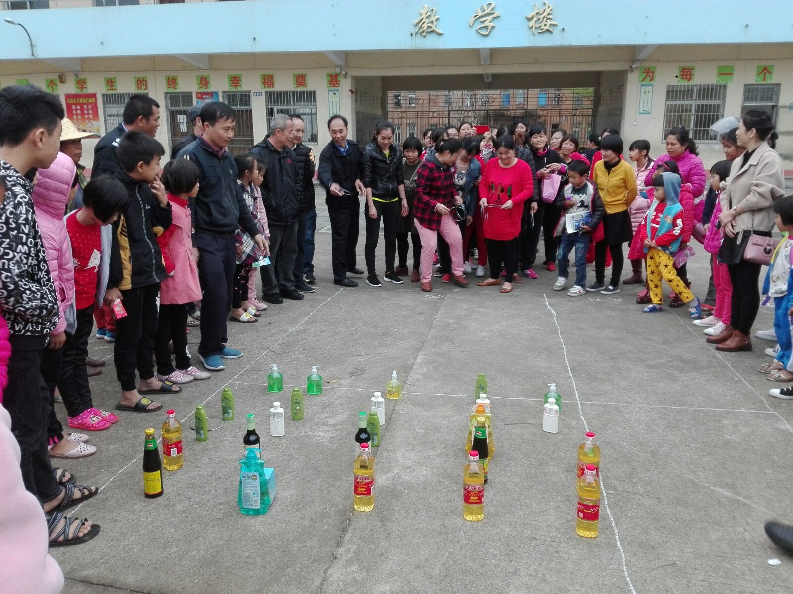 本次活动共分两个环节,一是‘袋鼠跳’,二是‘’套圈‘’。先由学校领导讲游戏规则,参加游戏的人员共分三个小组。