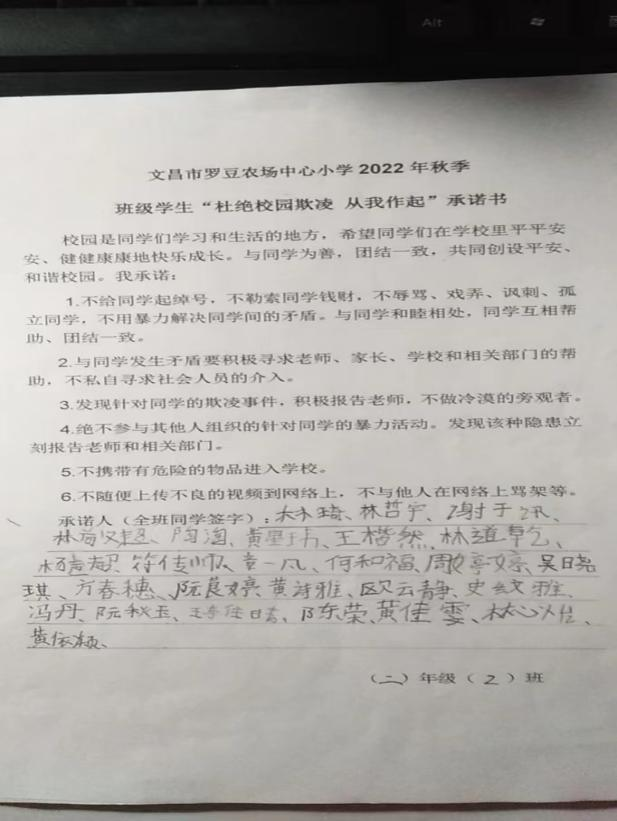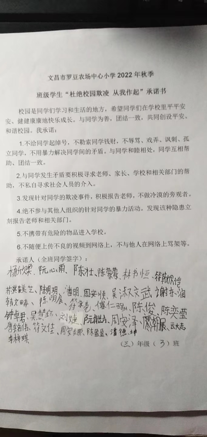 五、组织全体学生签承诺书学校发放《预防学生欺凌致家长一封信》,要求家长积极参与,细心观察自己的孩子,防止欺凌和被欺凌事件发生,一旦发现异常,及时与学校联系,合理妥善处置不良事件。组织学校班级的学生签订“杜绝学生欺凌从我做起”承诺书。