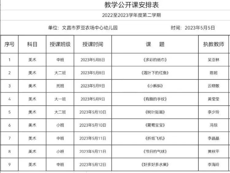 为了积极贯彻实施《3—6岁儿童学习与发展指南》精神,给教师创造一个相互交流、探究的教学平台,促进教师专业成长,提高教师的教育教学能力和幼儿园整体教学水平。同时,也为了丰富孩子们的美术活动内容和形式,激发幼儿感受美、表现美和创造美,发展幼儿想象与创造能力,2023年5月8日— 12日,文昌市罗豆农场中心幼儿园开展了教师美术公开课观摩活动。