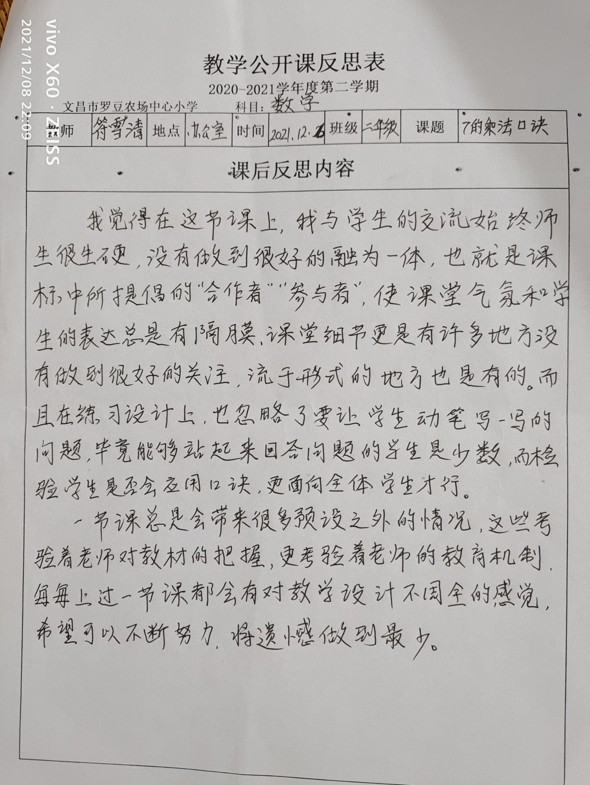潘家壮老师认为:教学目要详细,教学重难点突出,教学设计符合教材内容,教学设计有些杂,不能完全放手让学生自学。学生年龄较小,不容易把握,7的乘法算式和乘法口诀的编写是本节课的亮点,设计开放,教师上课语言要精炼,内容不能过于繁杂。