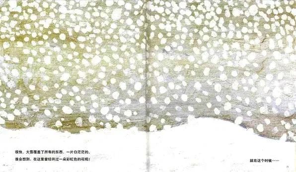 随着季节的变换,彩虹色的花慢慢枯萎老去,被掩盖在白茫茫的雪地下。虽然她离开了,可是它的希望和梦想还在继续,当春天来到时,新的花朵又在阳光下绽放开来…